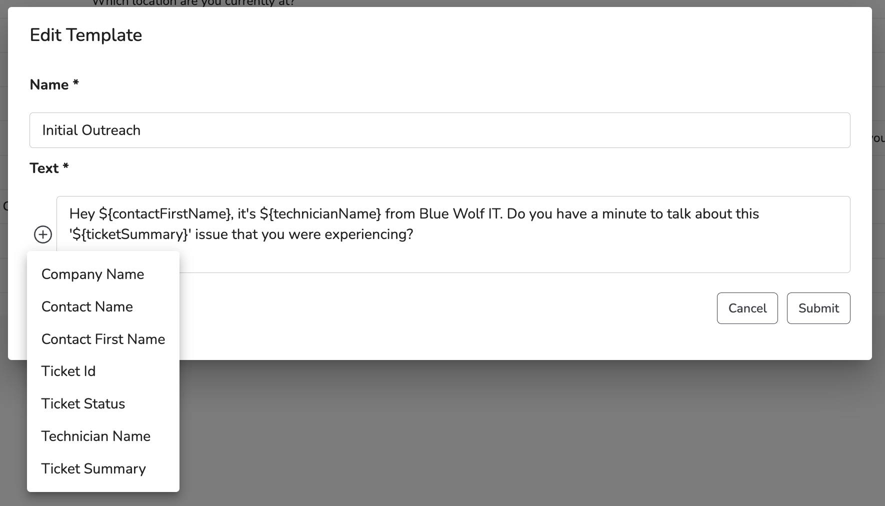 You can use variables in your Message Templates, and MSP Process will fill them in when your technician chooses to use a Message Template within the context of a ticket: