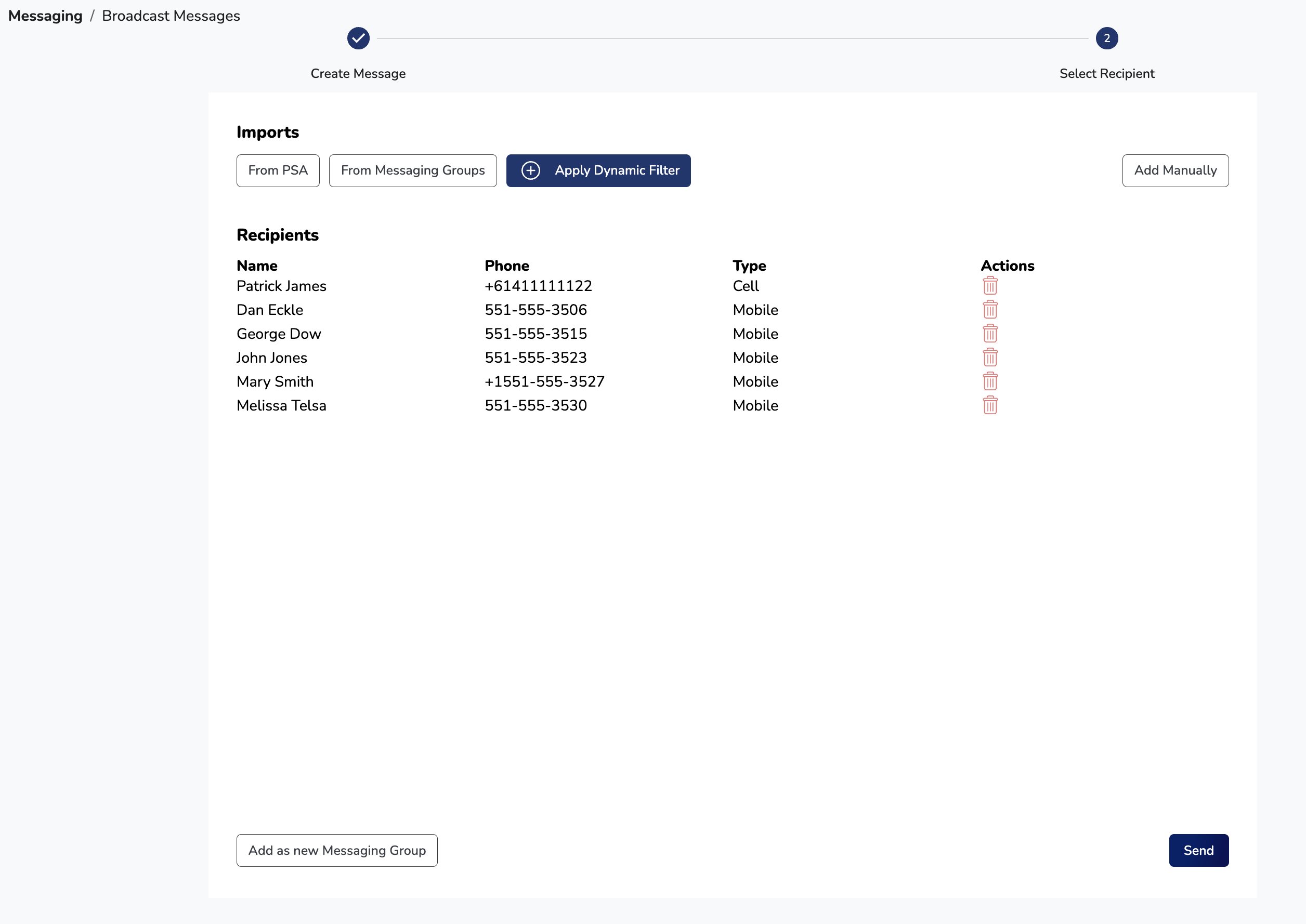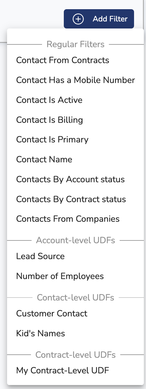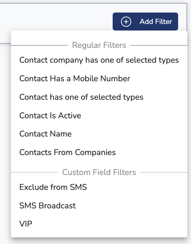 A Dynamic Filter (configurable under the Messaging -> Dynamic Filters page) allows you to "live" query your PSA to find contacts that match specific criteria - such as having a mobile phone, bring a Primary Contact, or having a custom property or UDF set to a specific value. Using a Dynamic Filter is the recommended approach to sending out text messages, as it leverages the data you already have in your PSA, with no additional administrative overhead.