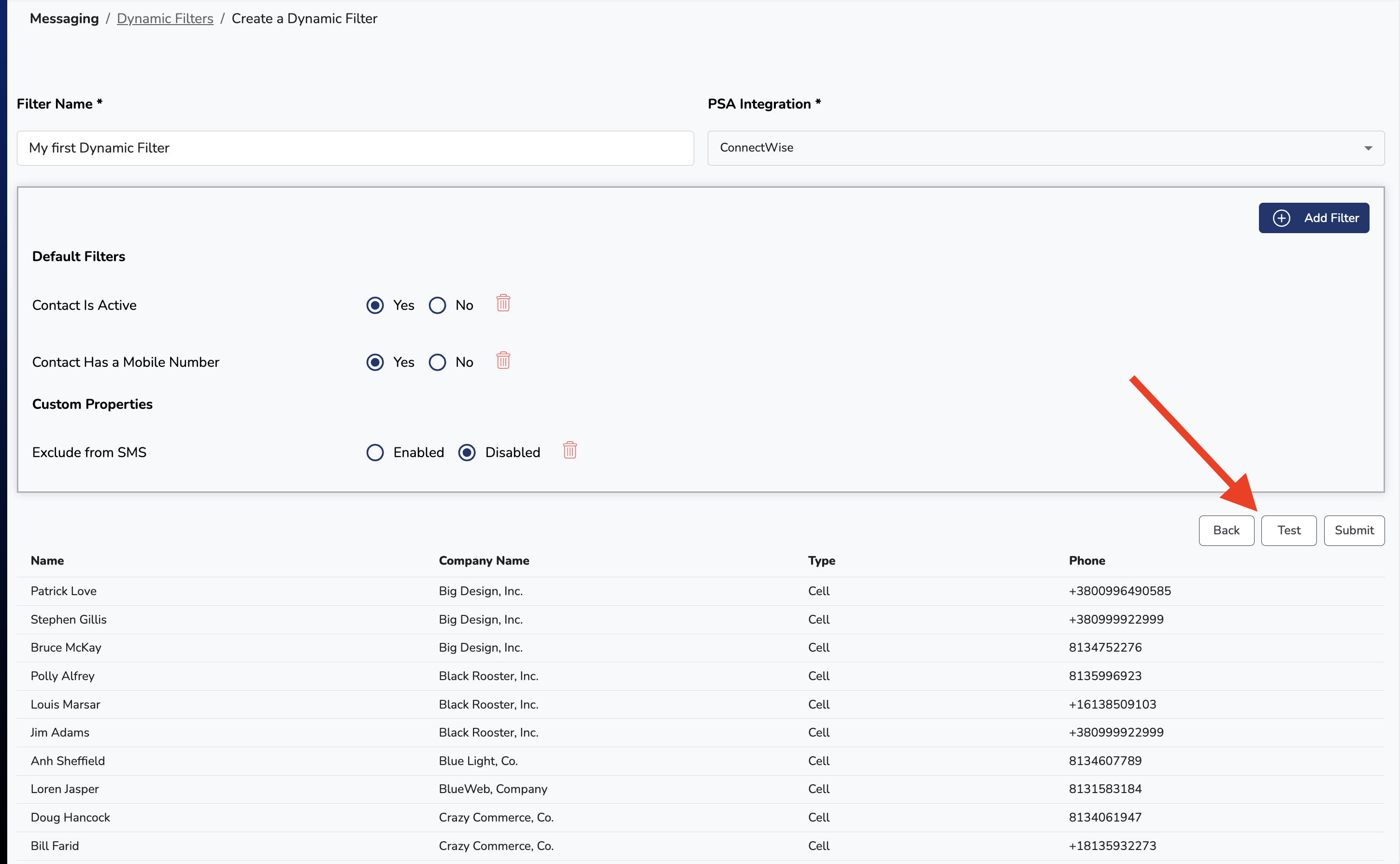 As your creating or modify a Dynamic Filter, it's useful to see what Contacts the Dynamic Filter will find in your PSA. Fortunately that's an easy task - at the bottom right-hand corner of the screen, simply click the Test button to see the results: