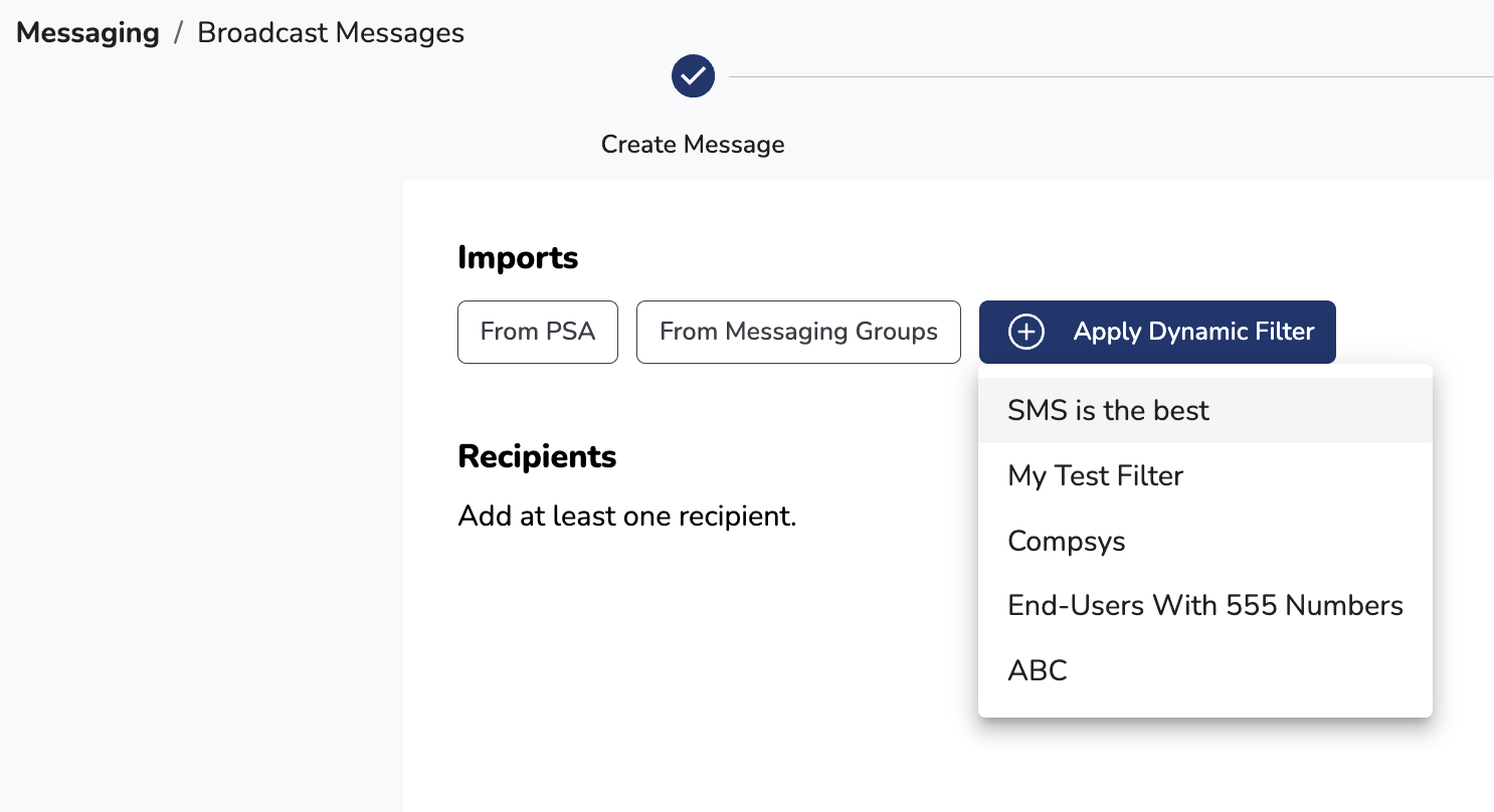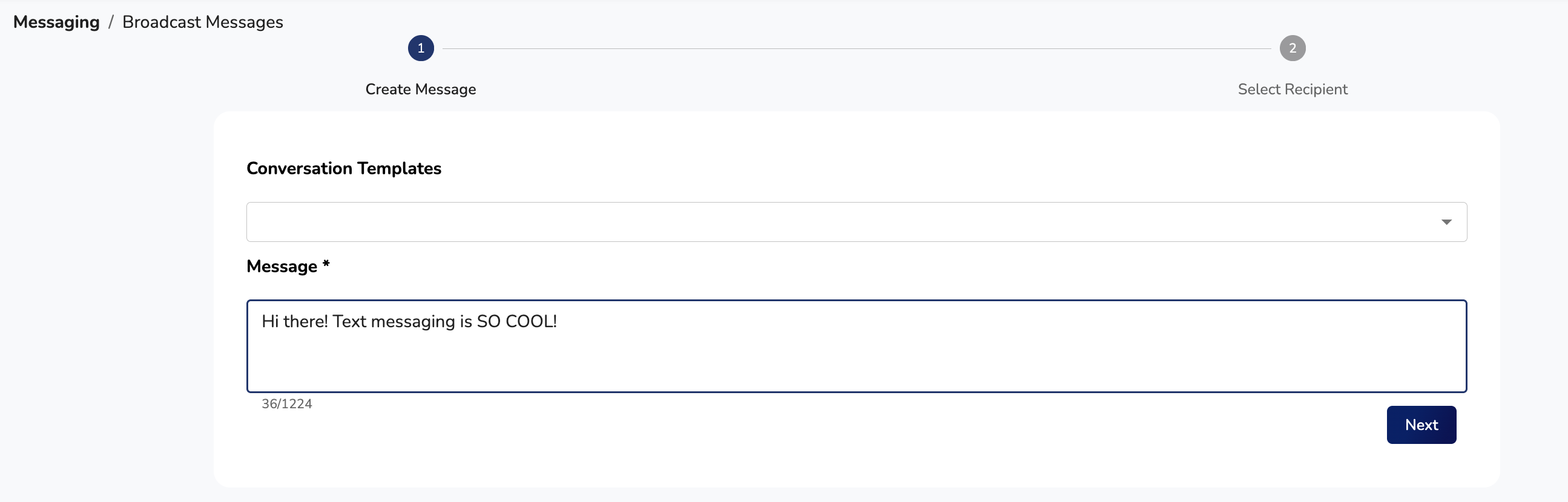 Once you've saved your Dynamic Filter, navigate to the Messaging -> Broadcast Messages page. Type out the text message that you want to send, and click the Next button: