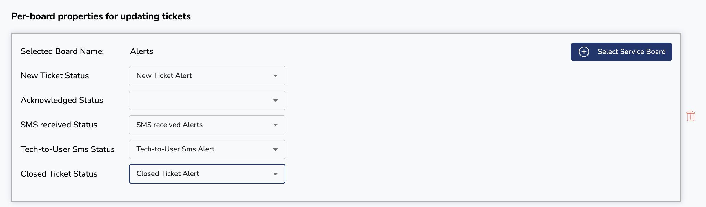 Many MSPs have a Triage service board where tickets first land, and those tickets are then reassigned to other, more appropriate Service Boards. If that's how your ConnectWise environment has been setup, you can specify how you'd like tickets to be updated by clicking the Add Service Board button at the bottom of the page, and selecting a Service Board to configure: