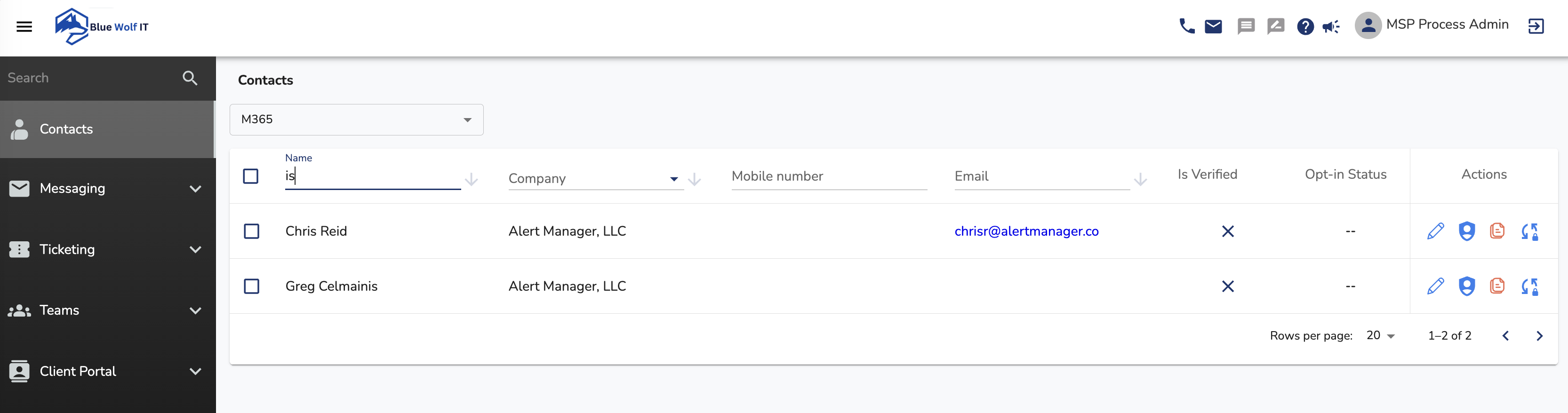 From the Contacts page, you can view the Mobile Number and E-mail address of each contact. From the Actions column, you can open the MSP Process Pod, which will allow you to perform End-user Verification, securely send your customers data, and respond to Technician Verification requests.
