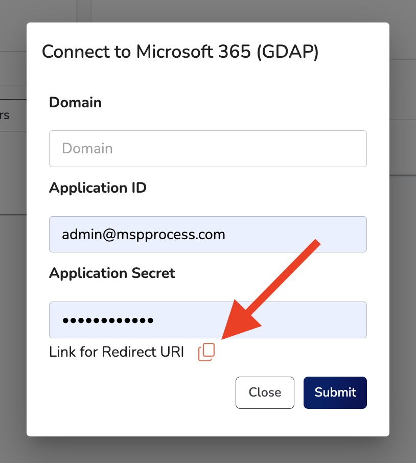 - In MSP Process, within the M365 integration that you created earlier, click the Connect to Microsoft 365 (GDAP) button