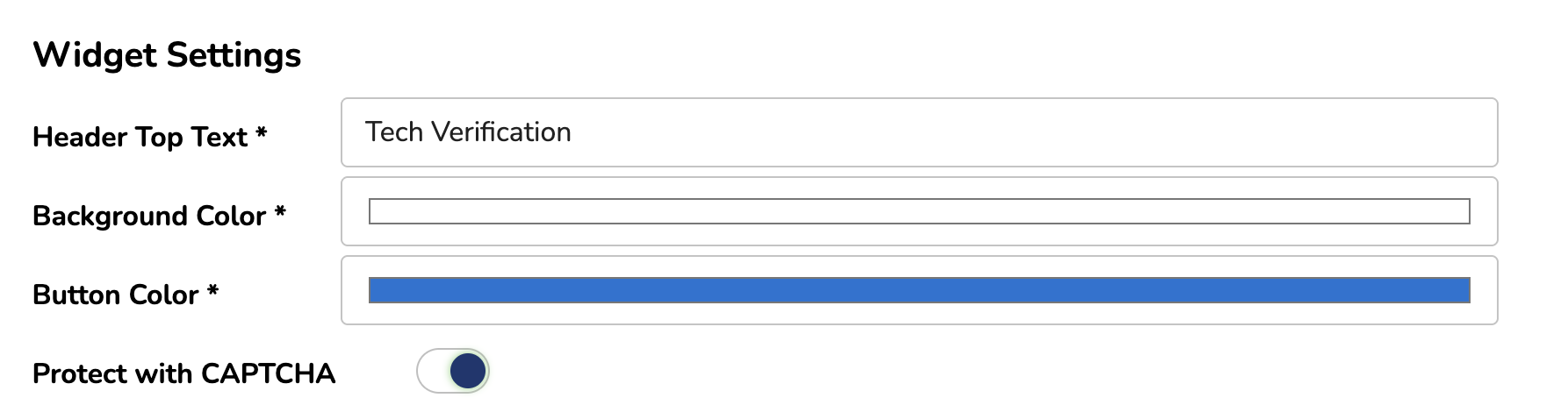 - Choose wether or not you want to protect the widget with a CAPTCHA checkbox; enabling this helps ensure that your system doesn't get spammed by somone maliciously submitting a bunch of Tech Verification requests