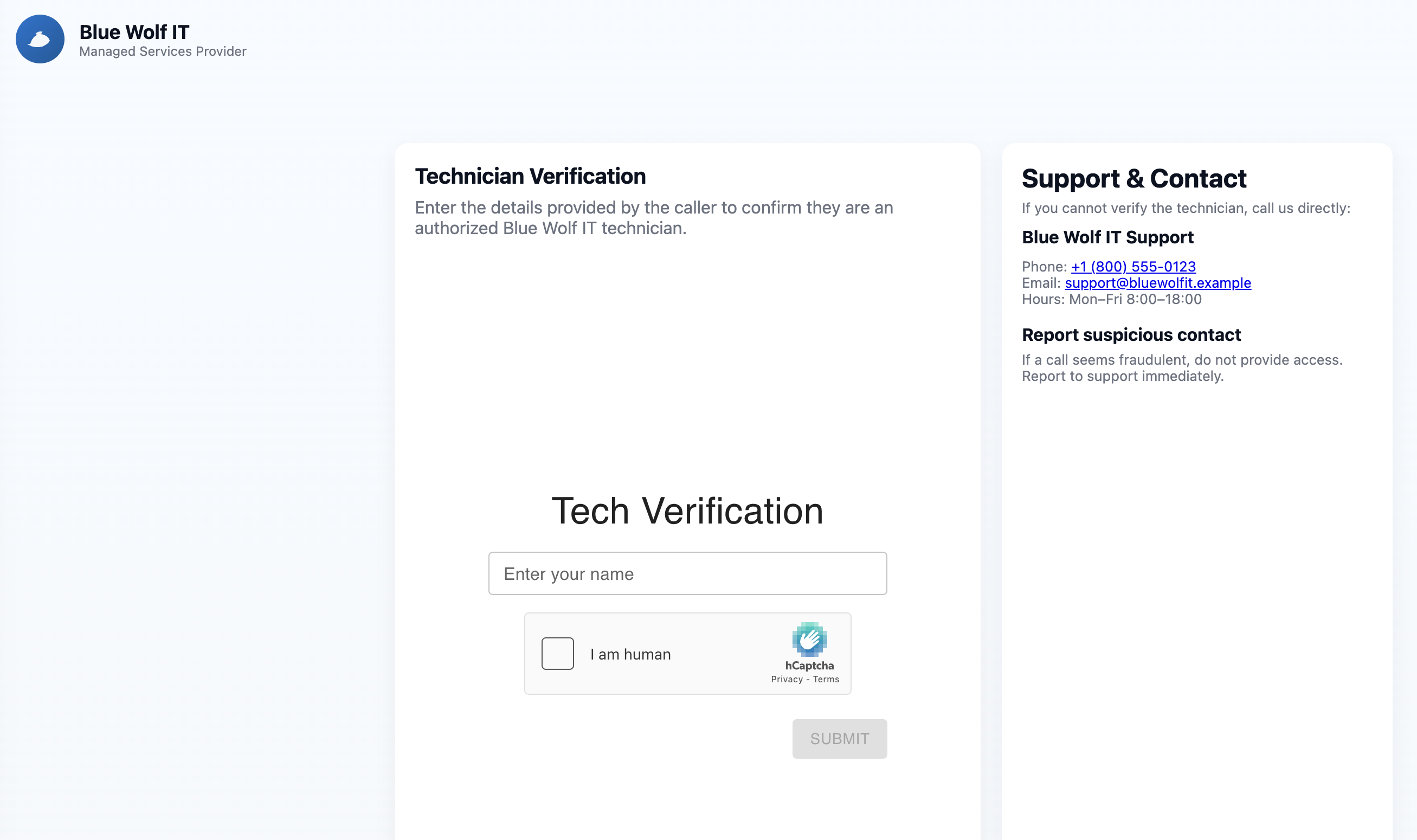 The Tech Verification widget helps you prevent your customers from falling victim to an identity phishing attack. Easily embedded as an iframe in your website, the Tech Verification Widget makes it easy for your customers to verify the identity of the technician who has called them.