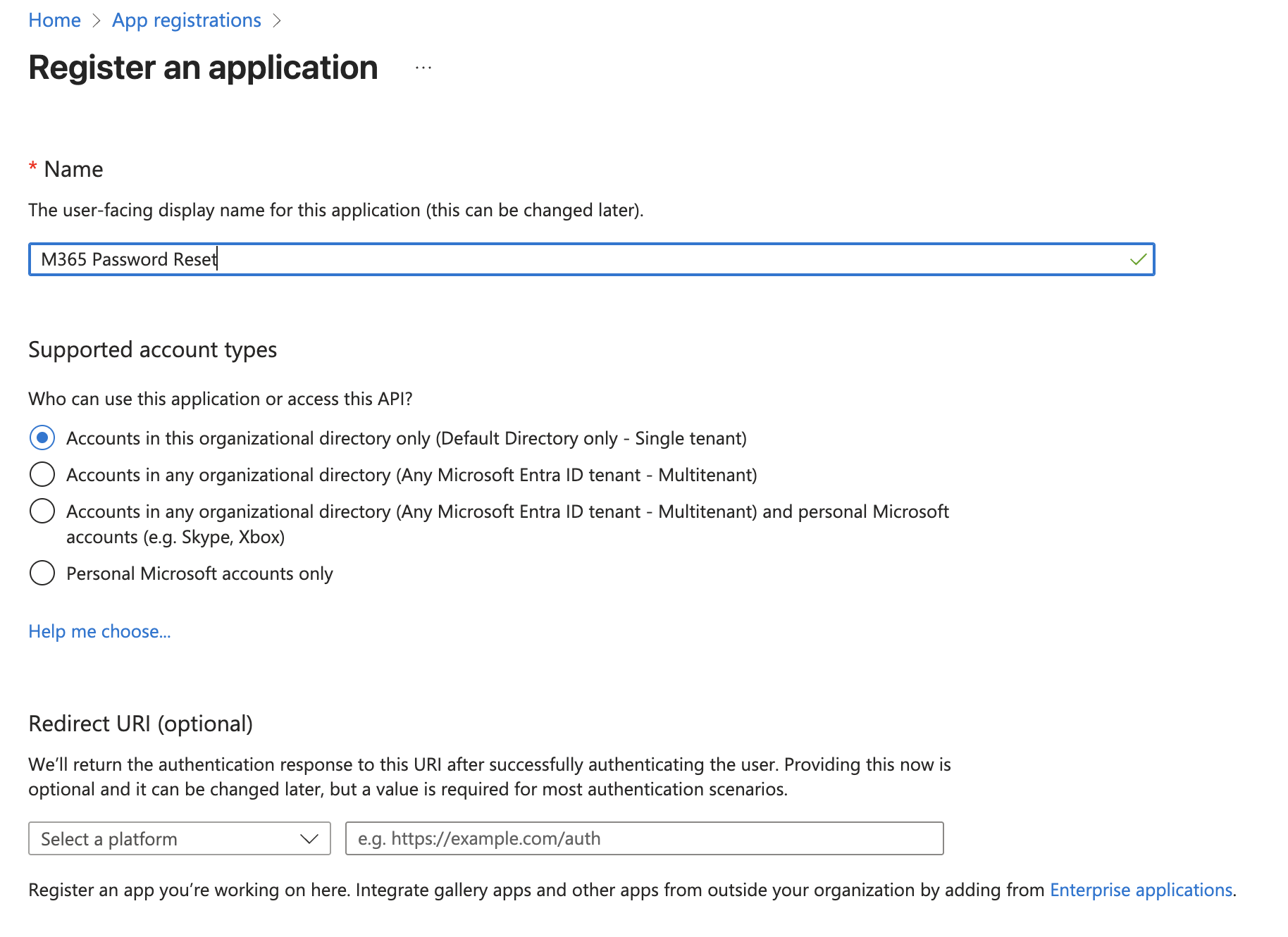 - Supported Account Types: Accounts in this organizational directory only (Default Directory Only- Single Tenant)