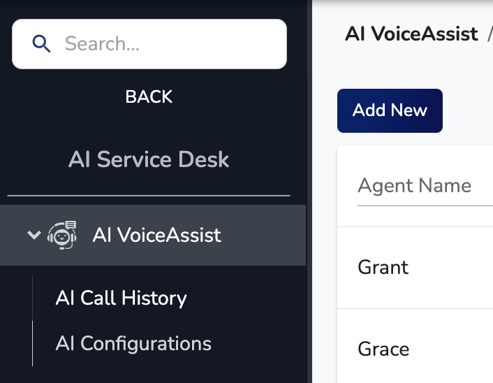 - In the left-hand menu, click on AI Service Desk > AI VoiceAssist > AI Configurations