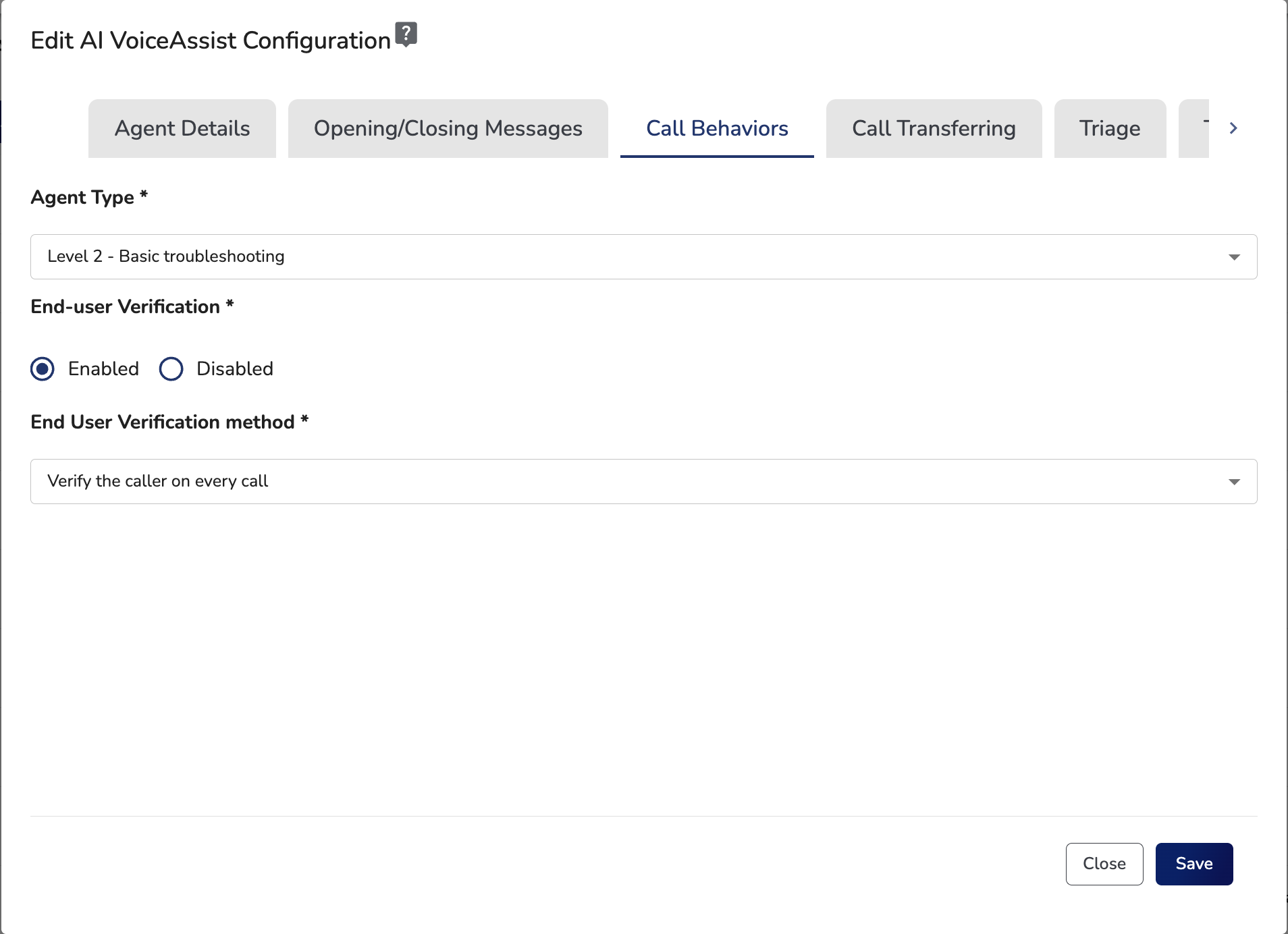 - The Greeting and Closing messages let you customize how your AI VoiceAssist agent begins and ends the call