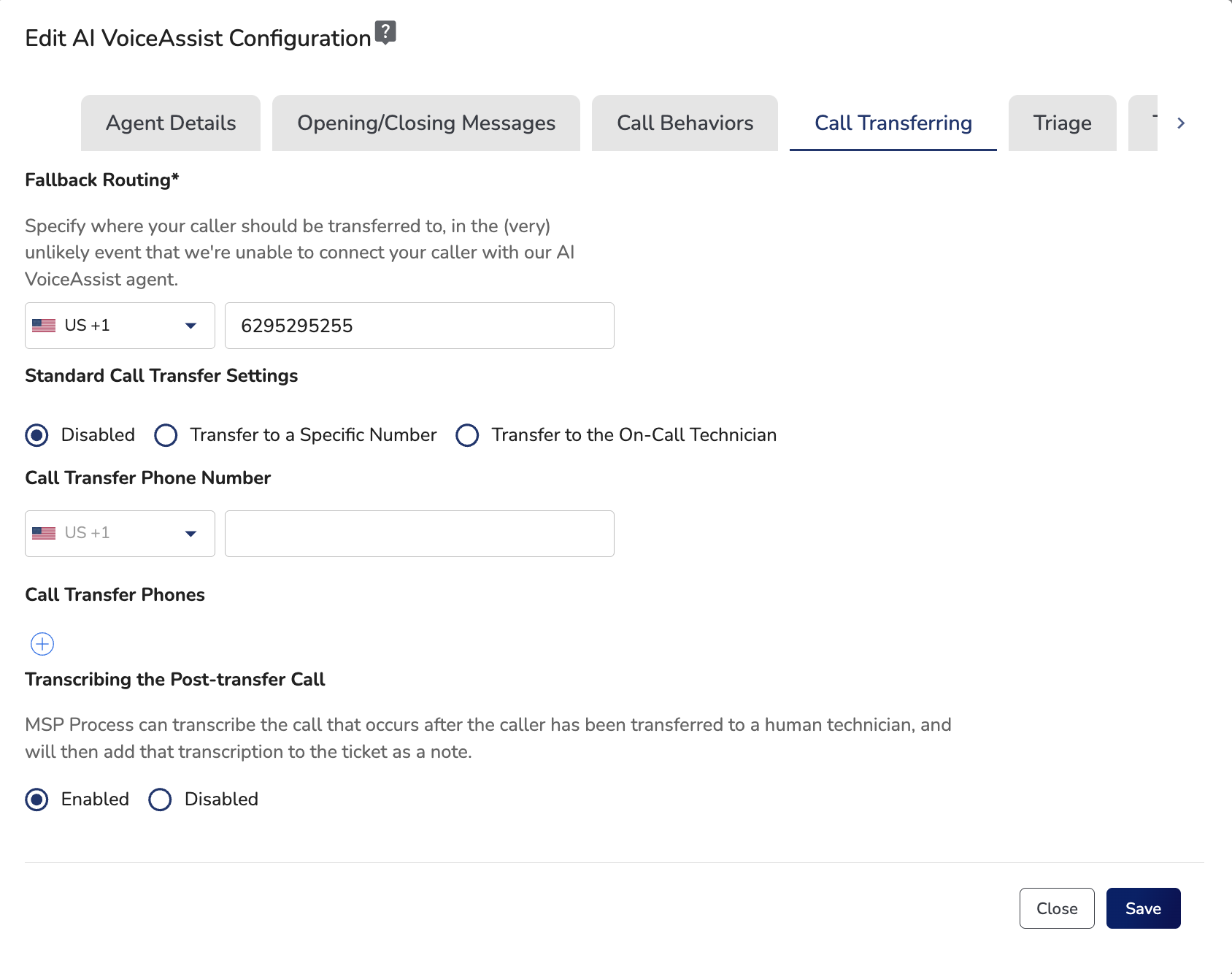 - The Allow Transferring The Call to a Live Agent option controls whether or not the AI VoiceAssist agent will transfer the call: